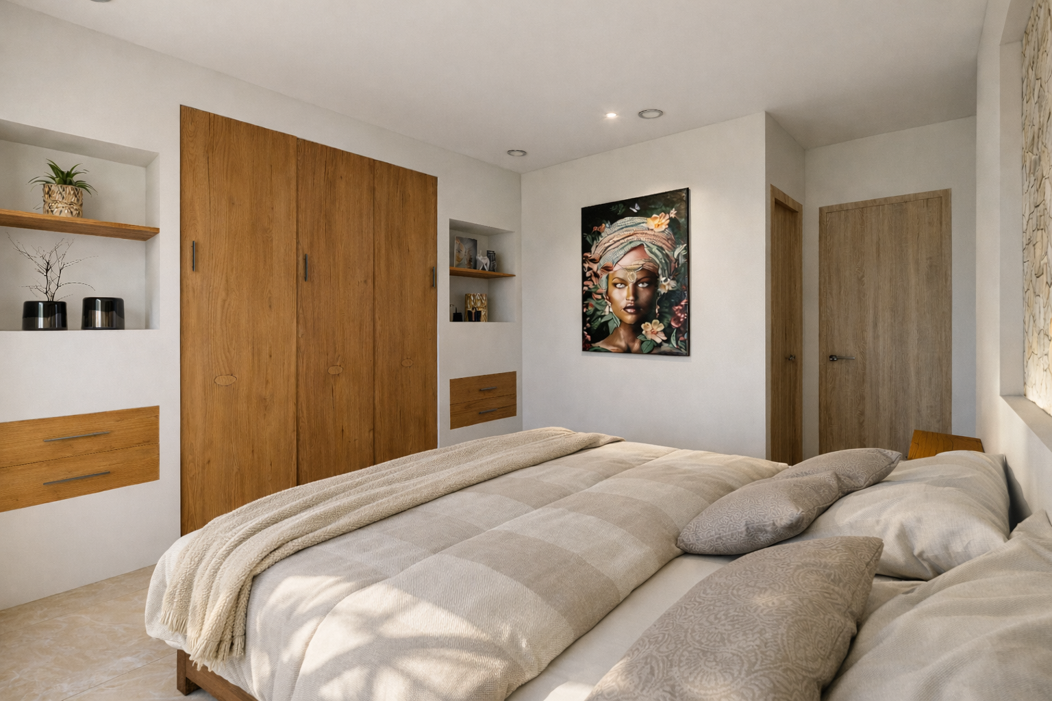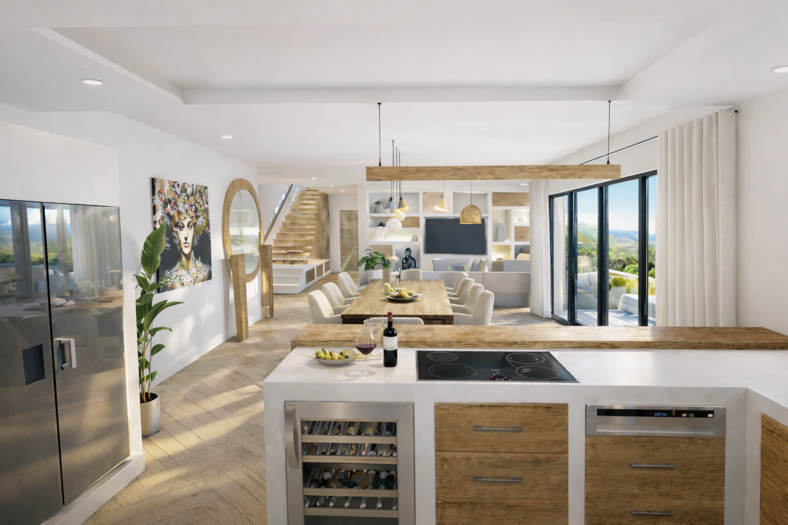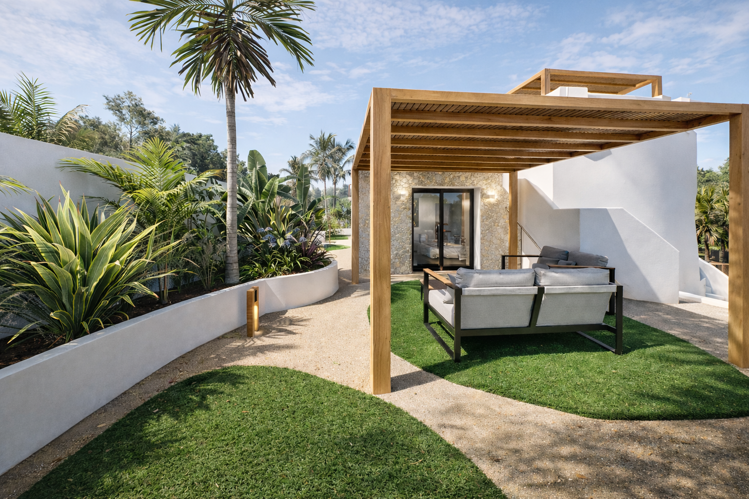 This private development in Benissa is designed in a refined Ibiza style where architecture, nature, and atmosphere blend seamlessly. Soft white volumes, rounded forms, and natural materials create a timeless Mediterranean character enriched with warm elements such as wood and natural stone. Large openings connect the interior with terraces and gardens, allowing natural light and the landscape to flow through the home. The outdoor spaces form a resort-like setting with tropical planting, lounge areas, an outdoor kitchen, and a swimming pool.