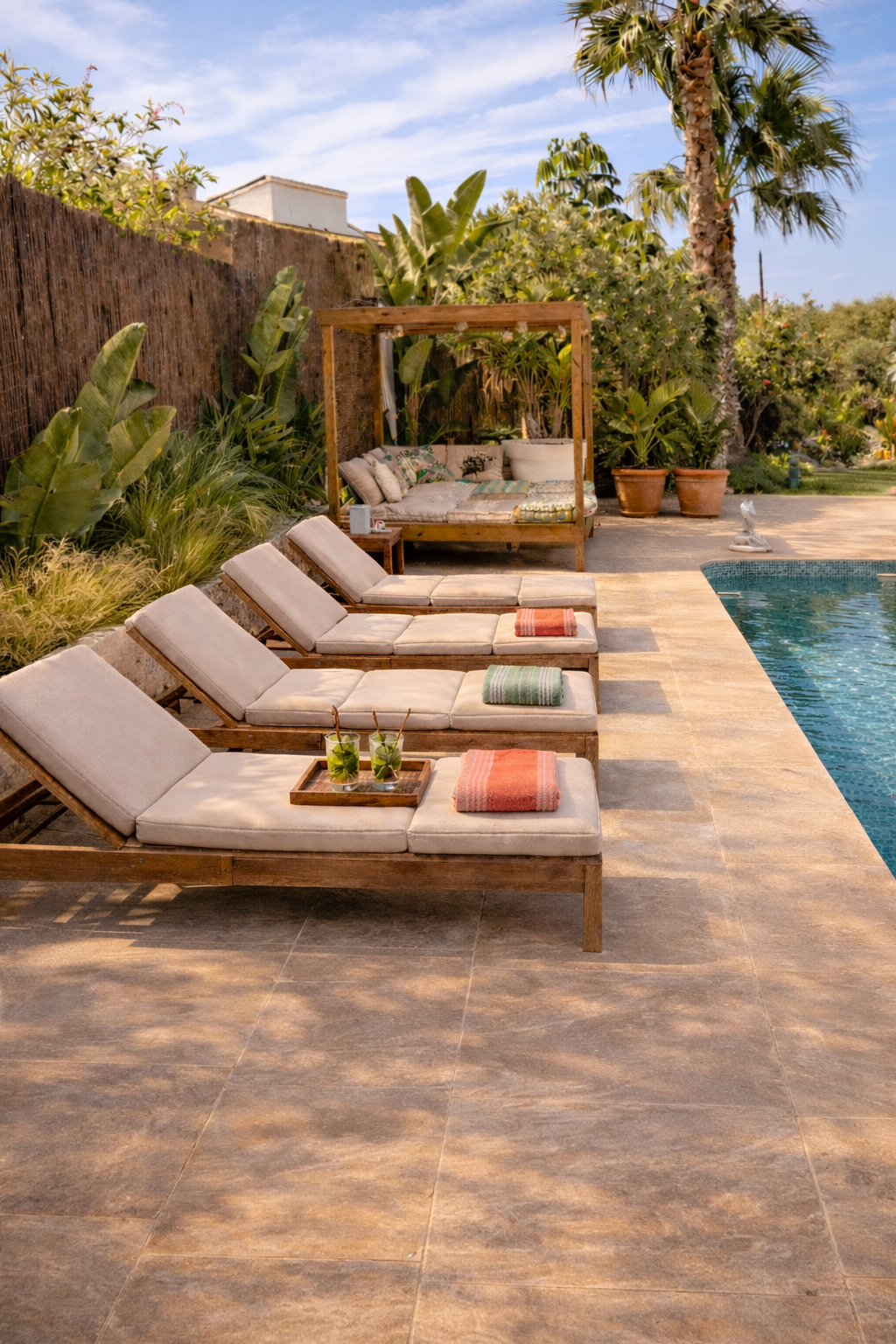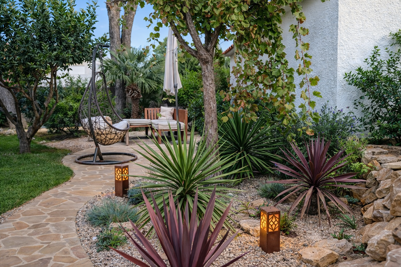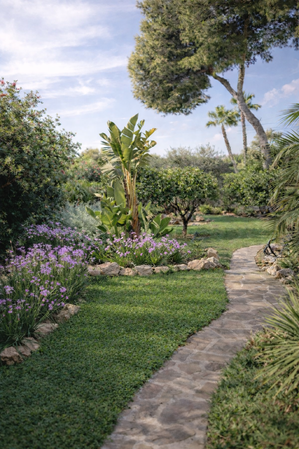 A Mediterranean garden designed for a luxury rental villa, combining lush planting with low-maintenance landscaping. Pool, terraces, and relaxation areas form one harmonious outdoor living space.