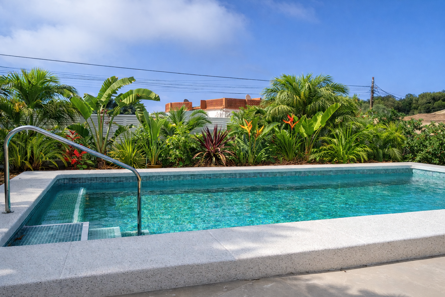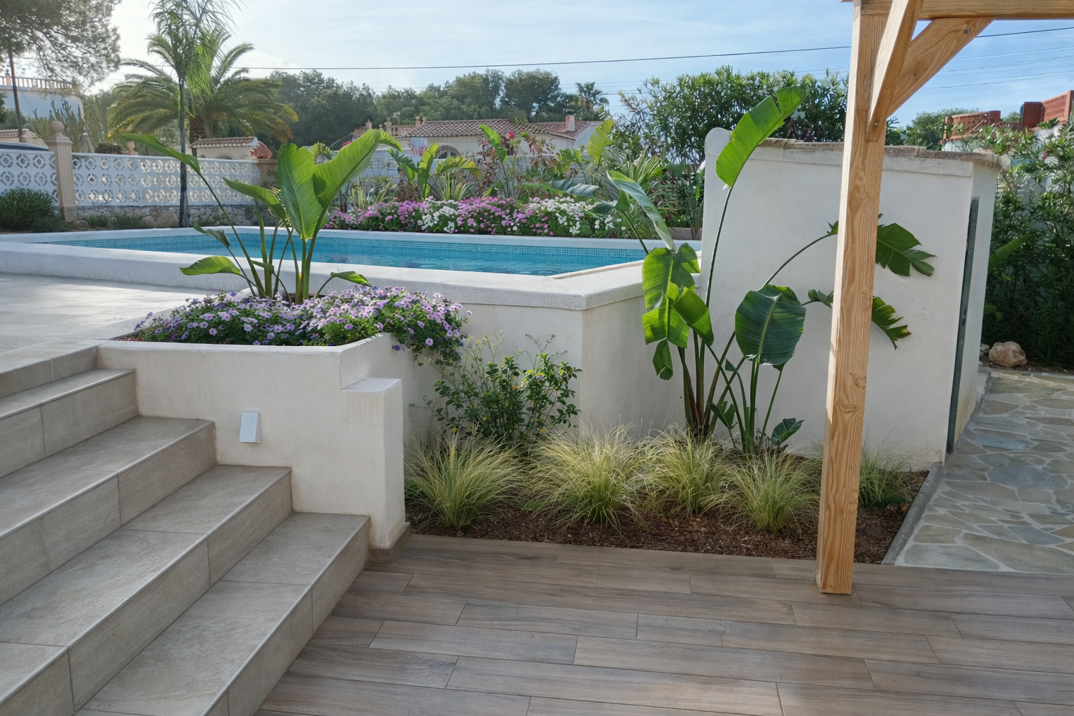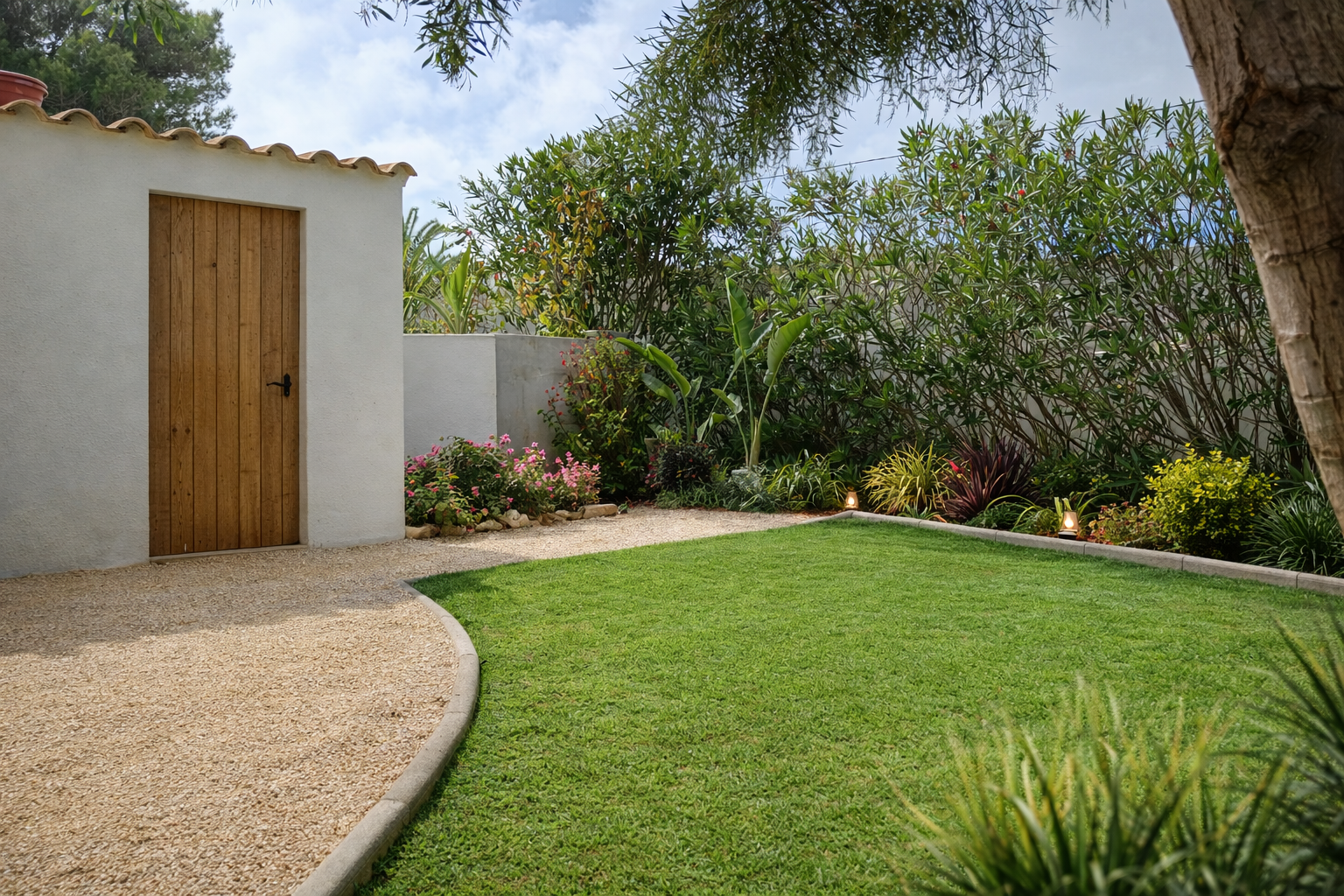 A Mediterranean garden designed for a luxury rental villa, combining lush planting with low-maintenance landscaping. Pool, terraces, and relaxation areas form one harmonious outdoor living space.