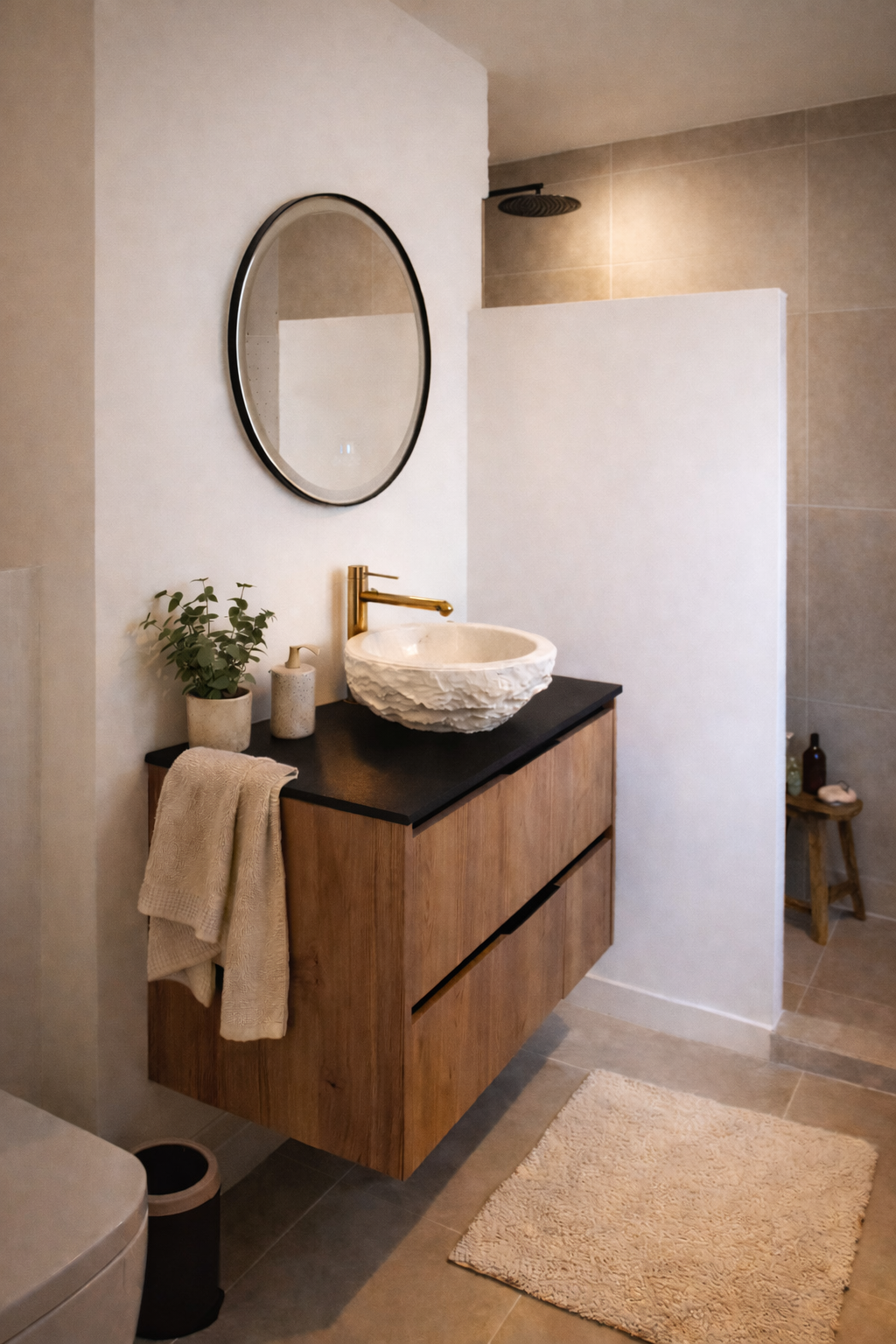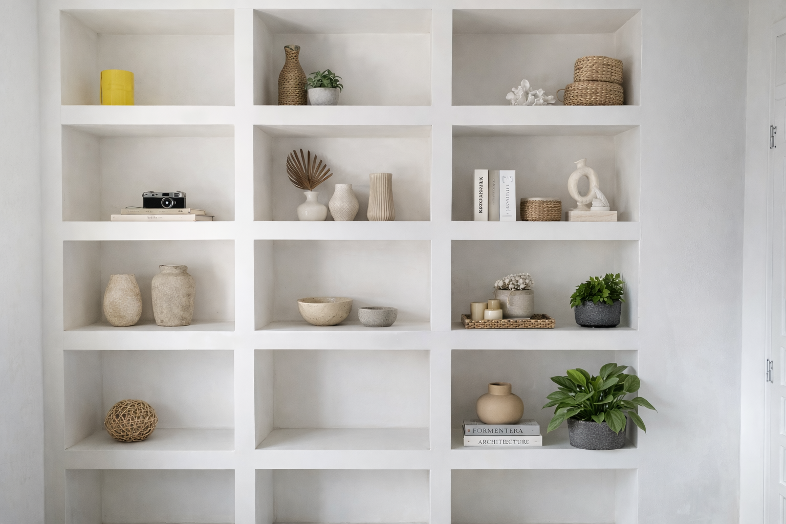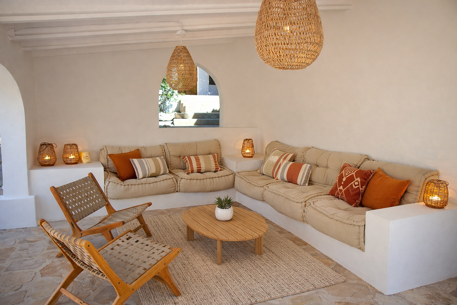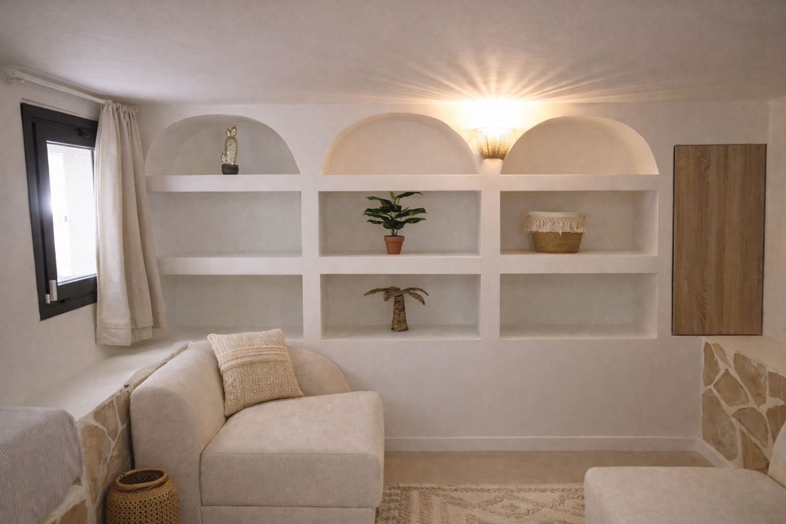 This Ibiza-style renovation creates a warm and timeless Mediterranean interior. Built-in niches, custom elements, and sculptural plastered volumes add depth while preserving the calm simplicity of Ibiza architecture. Natural materials and soft textures create a relaxed and elegant living environment.
