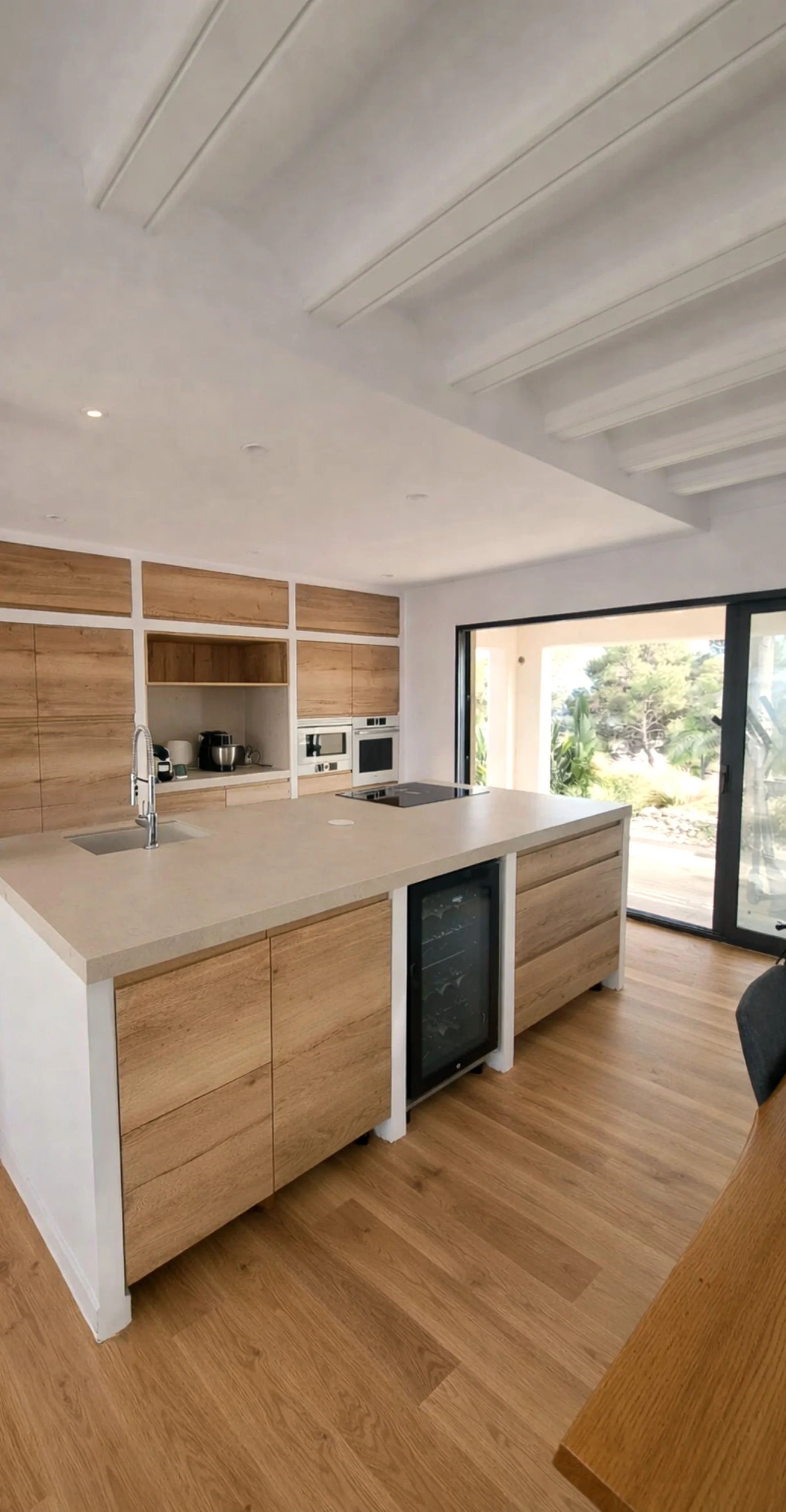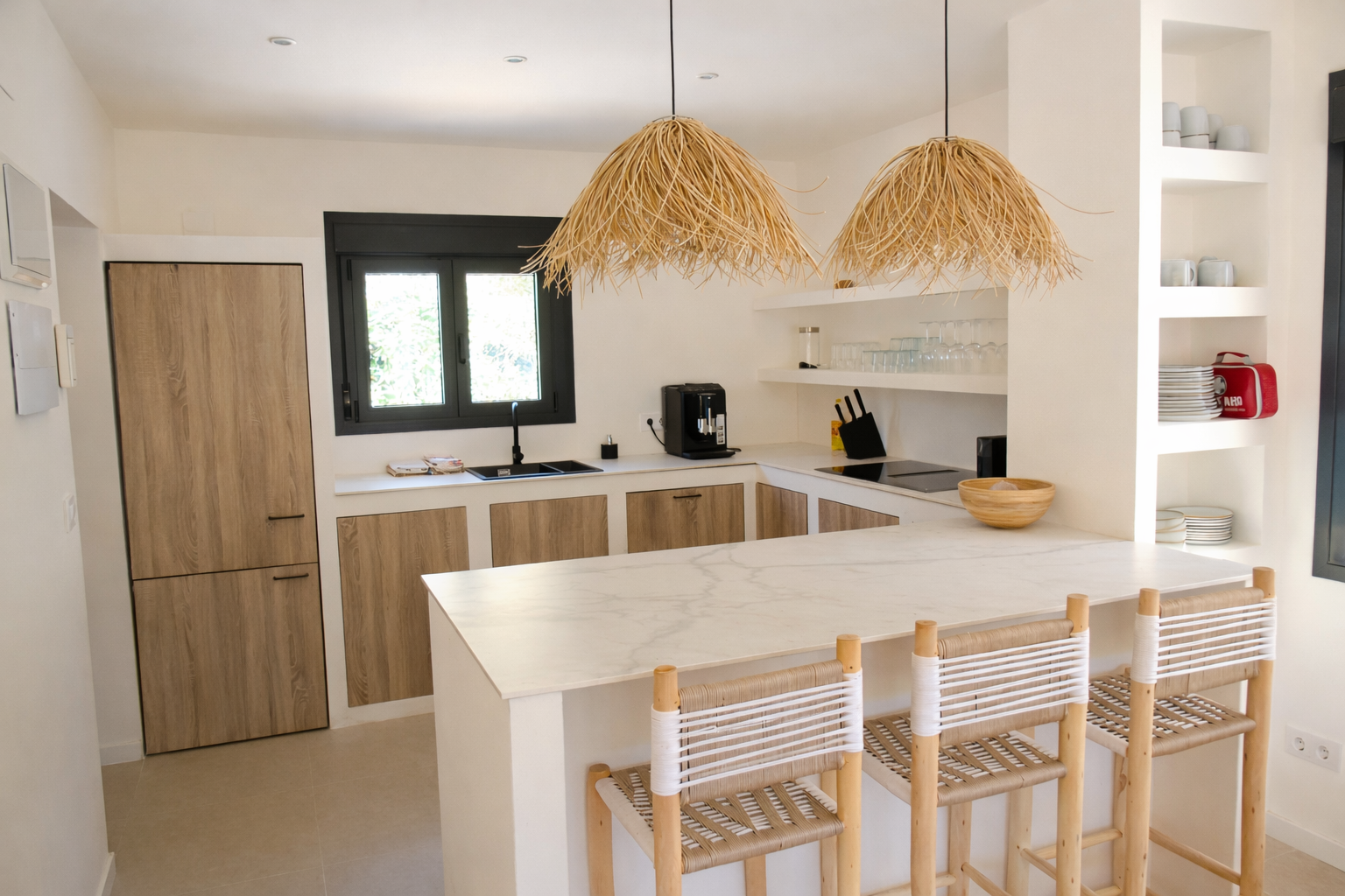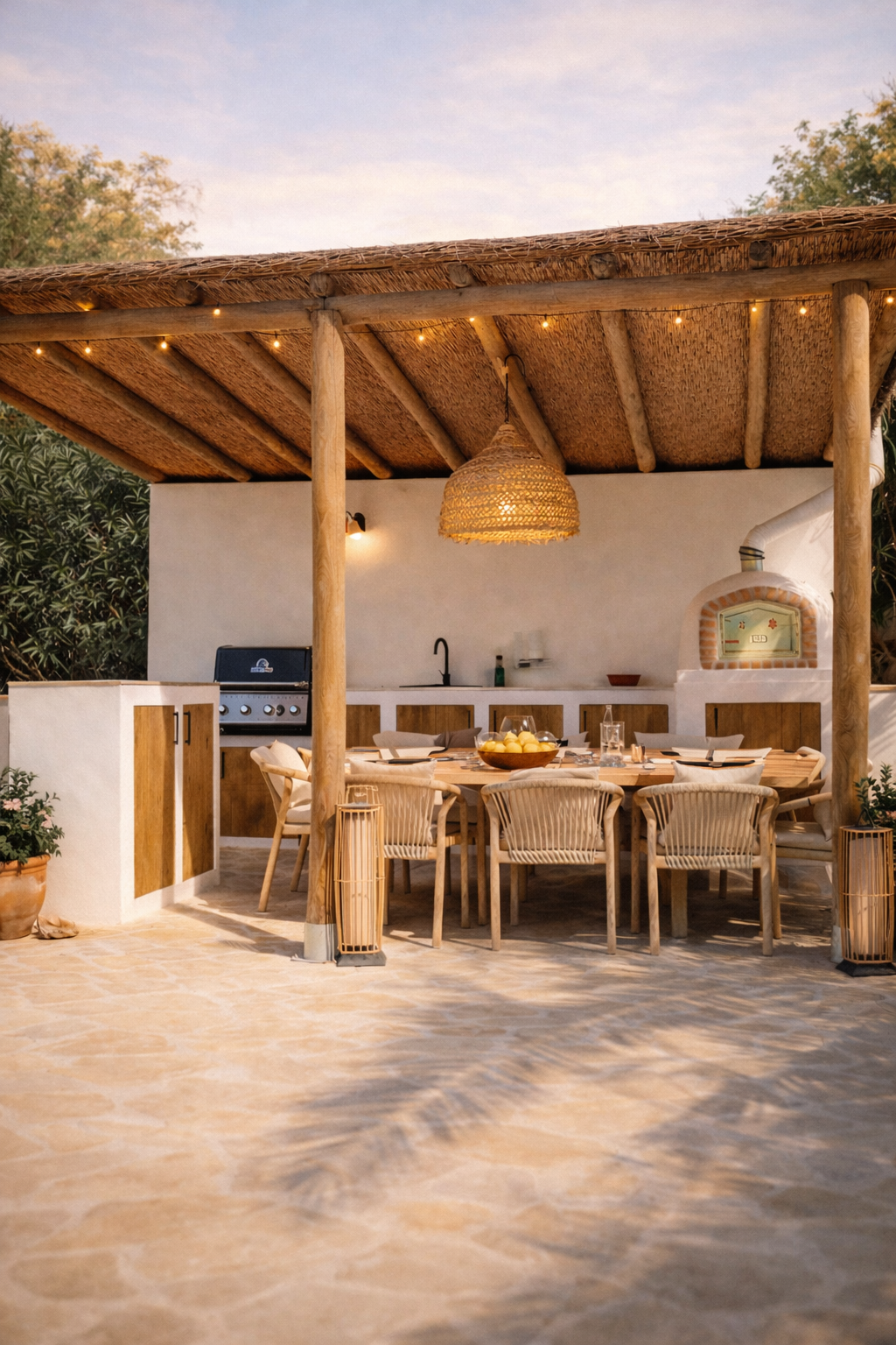 A traditional villa transformed into a warm Mediterranean home with Ibiza-inspired interiors, built-in elements, and natural materials. The outdoor kitchen and covered terrace extend the living spaces and embrace outdoor Mediterranean living.