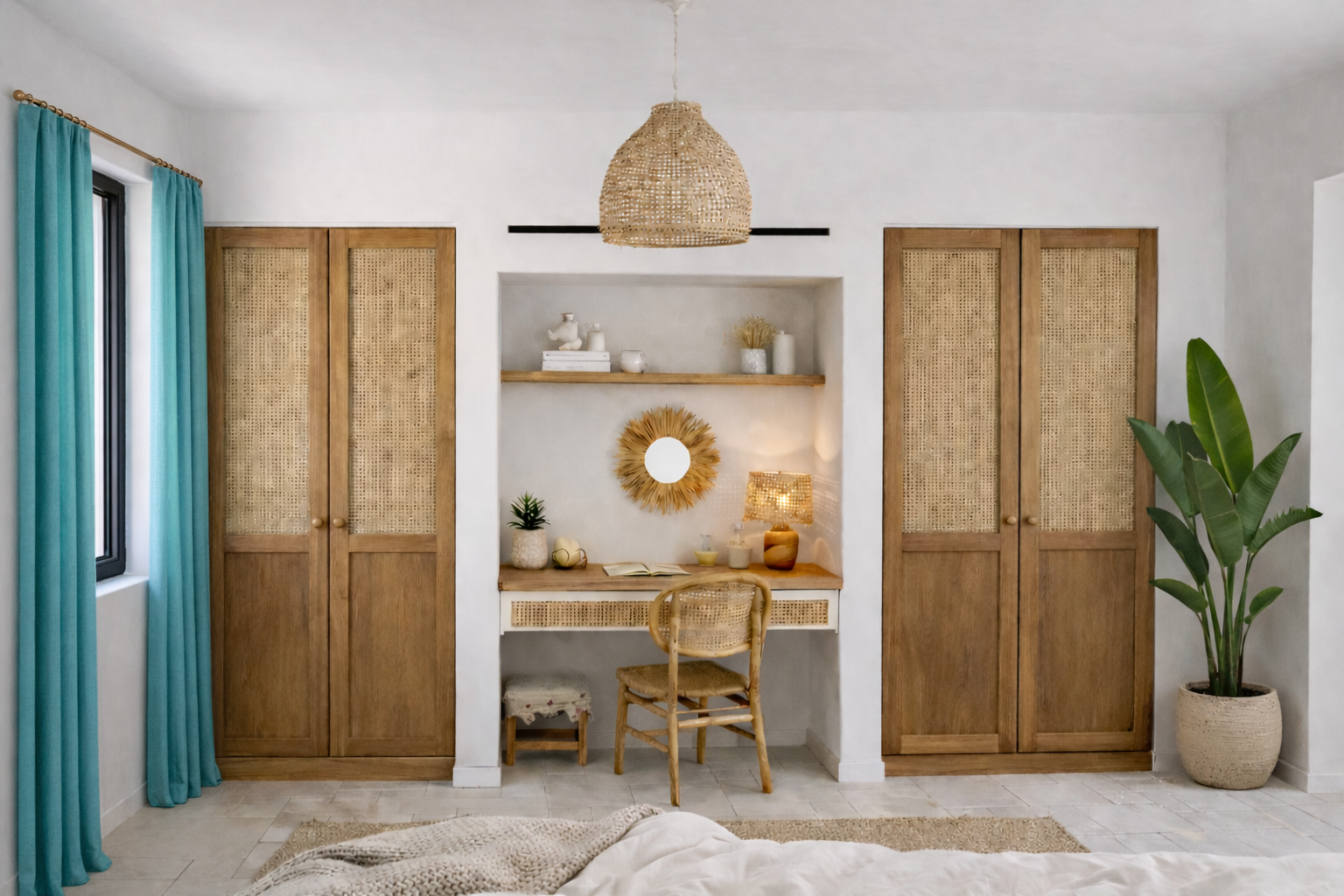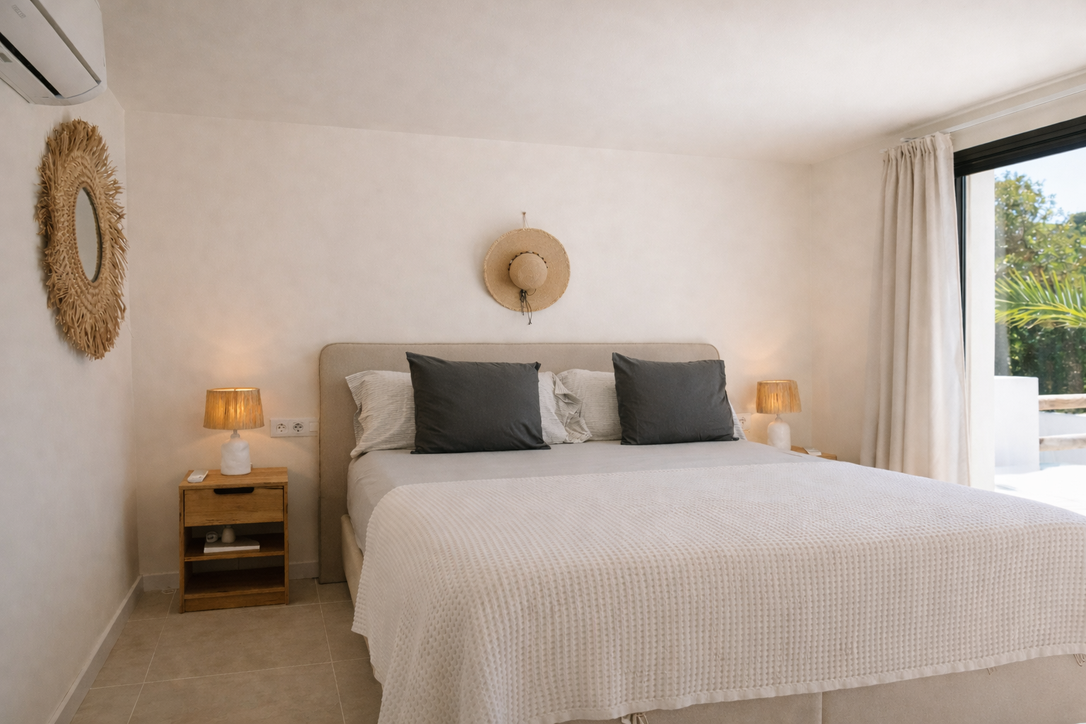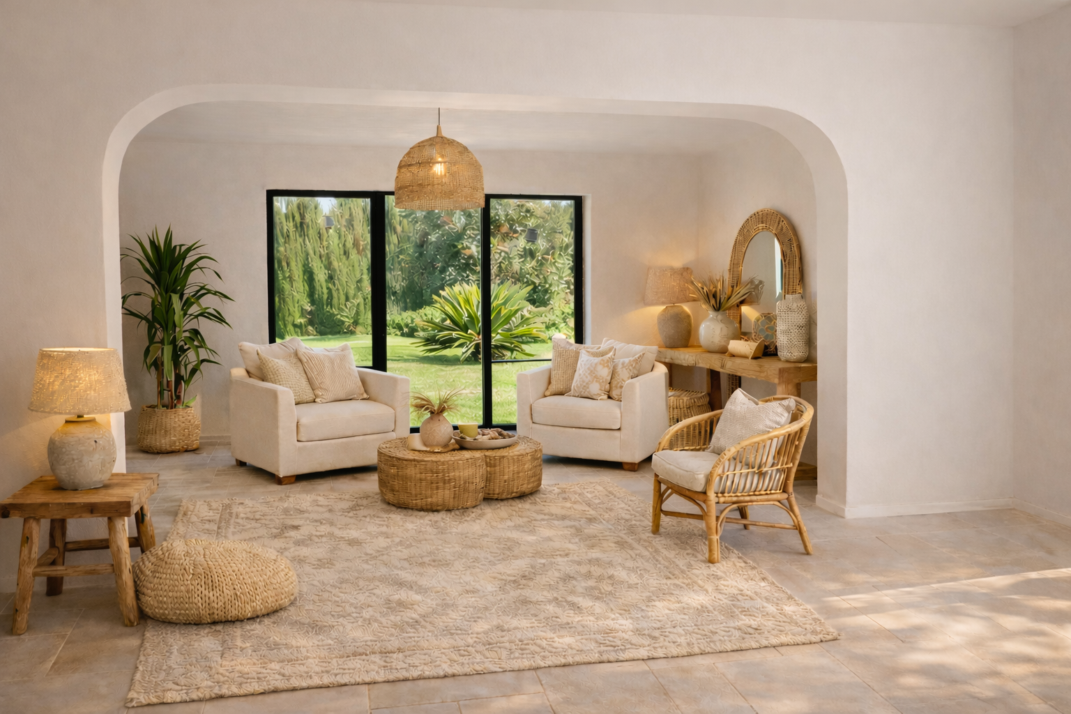 A traditional villa transformed into a warm Mediterranean home with Ibiza-inspired interiors, built-in elements, and natural materials. The outdoor kitchen and covered terrace extend the living spaces and embrace outdoor Mediterranean living.